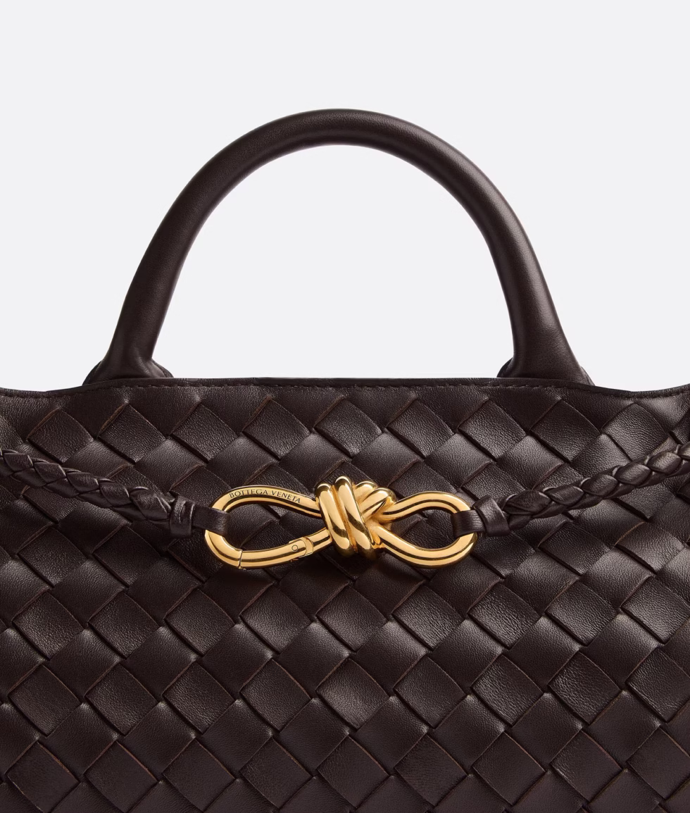 • Intrecciato leather top handle clutch with metallic knot closure